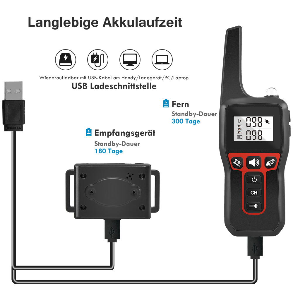 Viele Einstellmöglichkeiten, sowohl die Empfänger als auch der Sender sind leicht. Der Akku ist super, die Funktionen bei Nutzung von 2 Halsbändern einfach zu bedienen und zuverlässig.